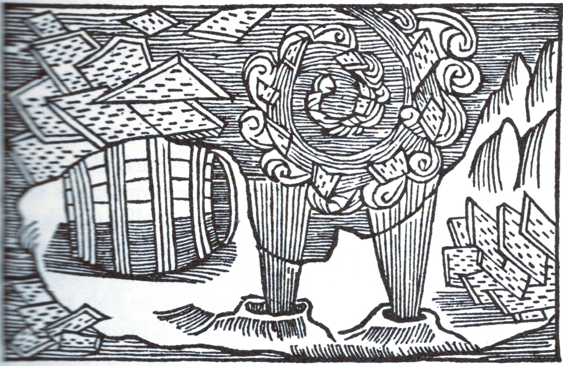 Í kaflanum á undan hefur verið sagt nokkuð um háreista klettinn Hvítserk, sem stendur mitt í hafinu milli Íslands og Grænlands; þó vil ég taka málið upp aftur til að útskýra það nokkuð. Á þessum kletti bjuggu um það bil árið 1494 tveir alræmdir sjóræningjar, Pining og Pothorst, sem fyrir grimmilegar misgjörðir sínar, sem þeir frömdu án tillits til yfirvalda og hernaðarmáttar, voru ásamt samverkamönnum sínum útlægir gerðir frá öllum mannlegum samskiptum samkvæmt ströngustu tilskipun konunga Norðurlanda, og þeir frömdu margar illgerðir gegn öllum sjómönnum sem fyrir þeim urðu, hvort sem þeir voru í nánd eða fjarlægð. Jafnframt frömdu á fyrri tíð enn fleiri og illræmdari sjóræningjar, kallaðir Vítalíar [fóstbræður], fjölda grimmdarverka, en var að lokum, eftir að öll norrænu konungsríkin sameinuðust gegn þeim, útrýmt úr tölu lifenda. Á sama hátt voru Kniphoff og sjötíu félagar hans handteknir af Hamborgurum árið 1525, og eftir að þeir voru dregnir út úr gríðarstóru skipi sínu, svokölluðu galleoni, var þeim refsað með öxi, steglu og hjóli. Á hæsta hluta Hvítserks, hafa fyrr nefndir Pining og Pothorst, látið setja stóran, kringlóttan áttavita með hringjum og línum gerðum af blýi, sem sjóræningjar geta notað til að finna beinni leið að fórnarlömbum sínum, svo að þeir geti fundið sér beinni leið til að afla sér ríkara herfangs. Á myndinni hér að ofan má einnig sjá tvo stríðsmenn af mismunandi hæð, þar sem sá minni, dvergvaxni maðurinn ögrar óttalaust hinum stærri og sperrir sig eins og sigurvegari. Því með sömu djörfung ræðst hann á stærri menn í öllum veðrum, líkt og hann státi af styrk risa og fái sigrað hvern sem er.